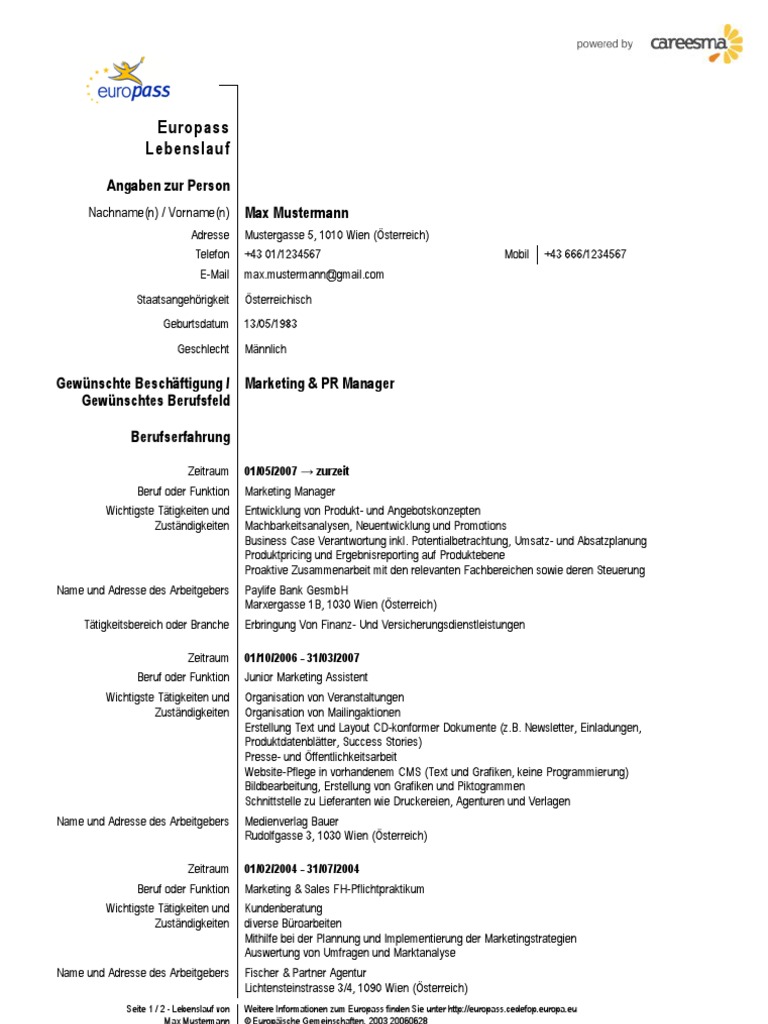Europass Lebenslauf Deutsch Muster Lebenslauf