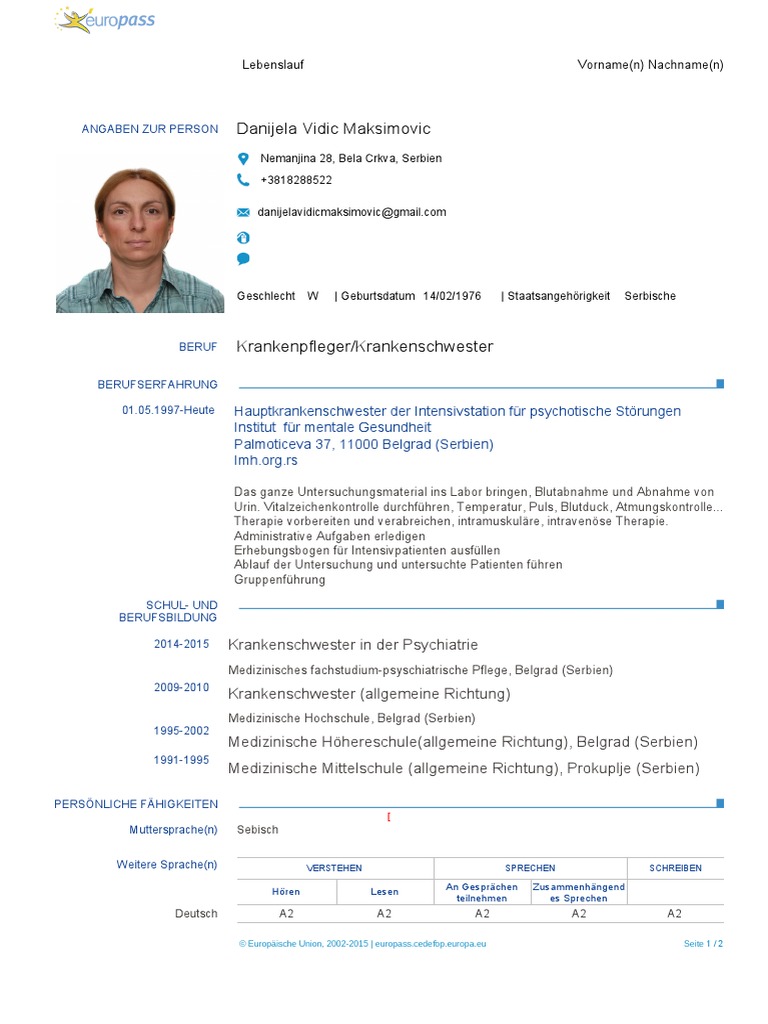 Europass Lebenslauf Angaben Zur Person Berufserfahrung Pdf Kostenfreier Download